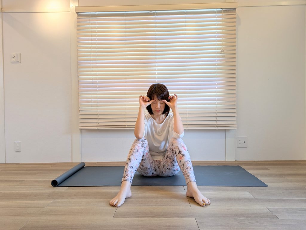 首肩の力を抜き、親指の腹を眉頭にそえて頭の重みを使ってじんわりと圧をかけましょう。