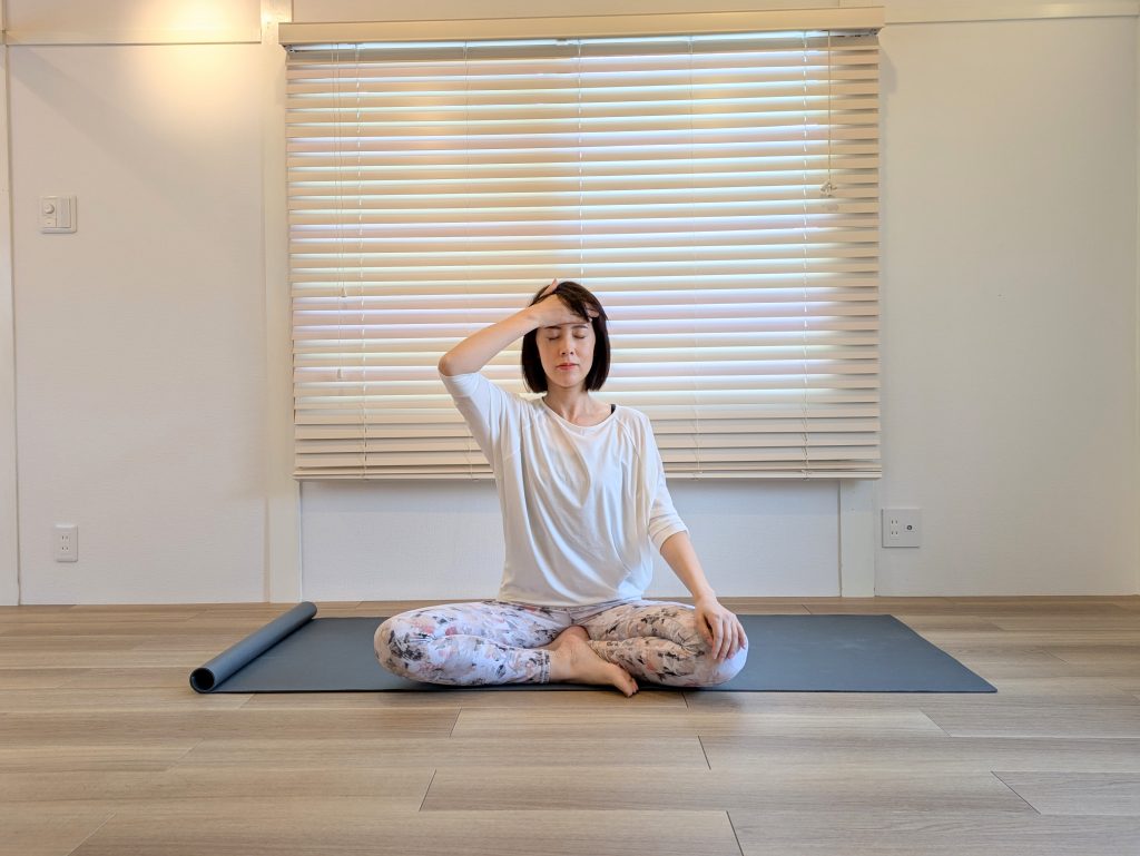楽な姿勢で座り、片手で額を覆って目を閉じます。