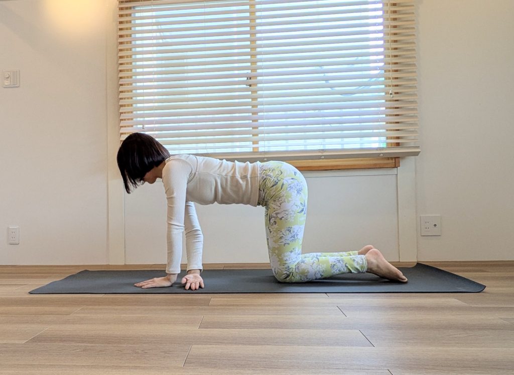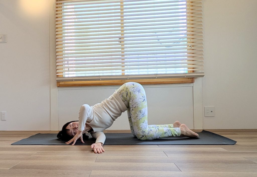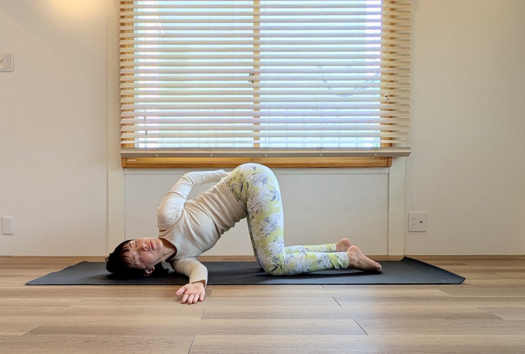 キャットツイストは、四つ這いの姿勢から背骨をやさしくねじり、肩とこめかみを床にあずけていくポーズ。