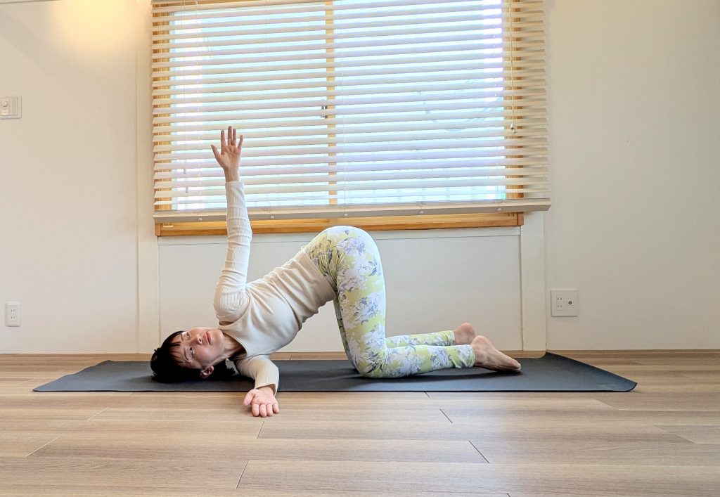 余裕があれば、左手を真上に引き上げ、目線も空へ。頭だけに体重が乗らないよう、マットと接している体全体でグラウンディングしましょう。