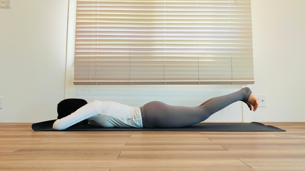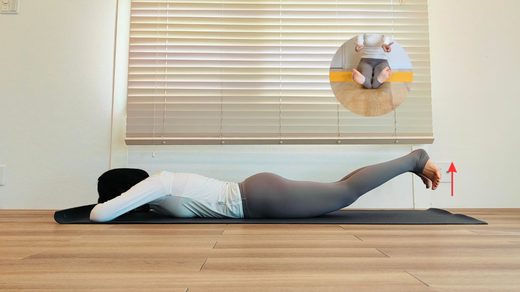 - うつ伏せになり、かかとをつけて、つま先を開きます